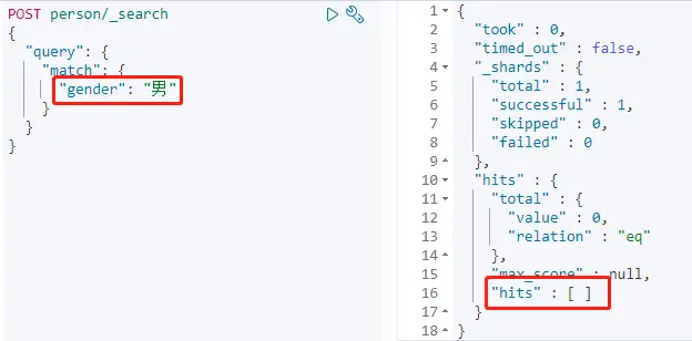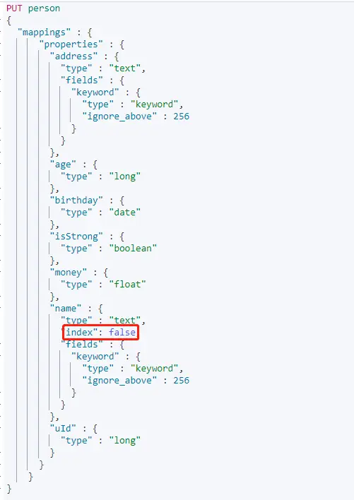 在字段中使用 index 指定当前字段索引是否能被搜索到。指定类型为 boolean 类型,false 为不可搜索到,true 为可以搜索到。 先删除之前的 Mapping: