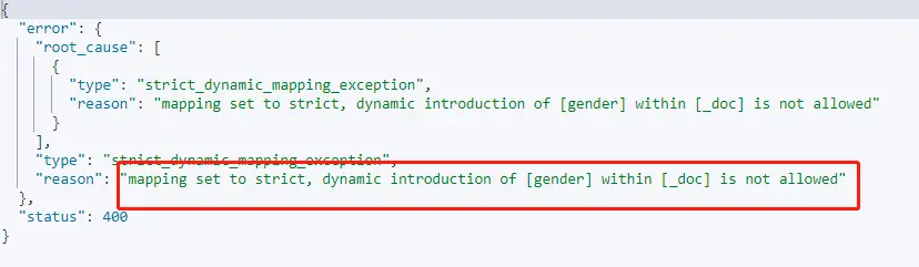 设置 dynamic 为strict时,从字面上意思也可以看出,对于动态映射是较严格的,新增字段数据不可以写入,不可以被索引,Mapping 结构不会被更新。只能按照定义好的 Mapping 结构添加数据。