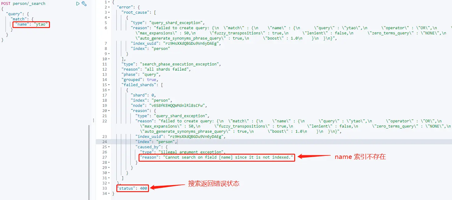 字段 index 设置 false 后,由于没有被索引,所以搜索无法获取到索引。
