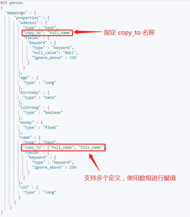 聚合多个字段放到一个索引中,使用 copy_to 进行聚合。例如我们在多字段查询中,这是不需要对每个字段进行过滤筛选,只需对聚合字段即可。 在使用 copy_to 时,是通过指定聚合的名称实现。