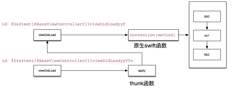 第二段,它是一个thunk函数,它的标识id是@?s4test18BaseViewControllerC11viewDidLoadyyFTo ,对比一下第一段id是@$s4test18BaseViewControllerC11viewDidLoadyyF ,第二段的id是在第一段的基础上增加了两个单词To,并且通过@convention(objc_method)可以看到,它是使用ObjC方式调用的;它的内部使用Swift原生方式调用第一段的函数;