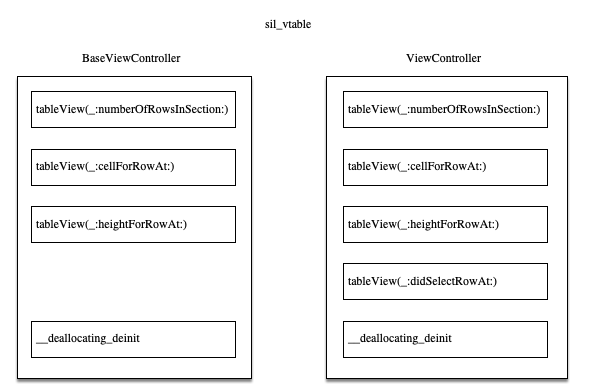 基类BaseViewController和子类的ViewController各自的sil_vtable中,都有table(_:didSelectRowAt:) ,且子类中对应方法标记为[override ];