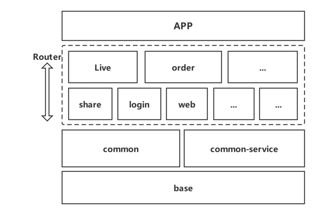 第一层:空壳app。应用的入口,可存放启动页,依赖所有业务组件