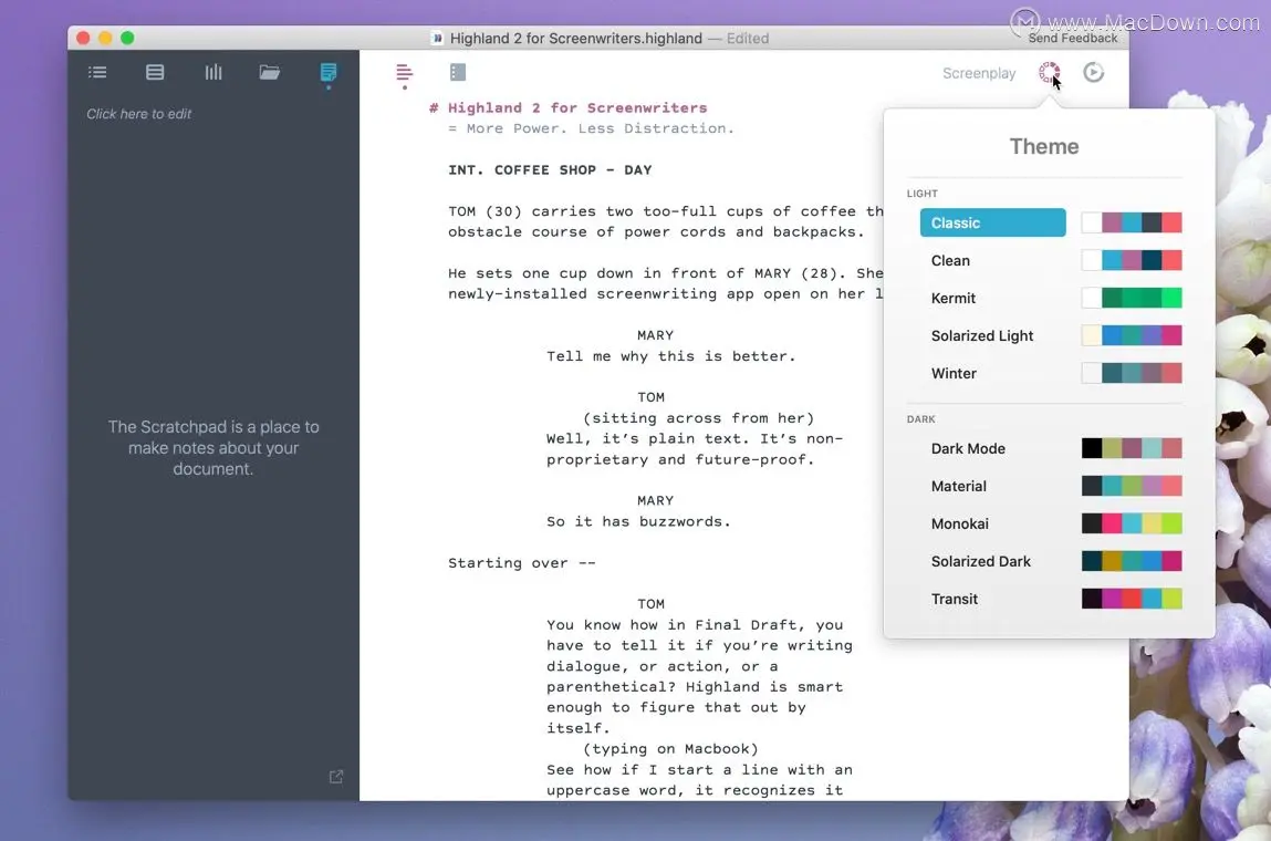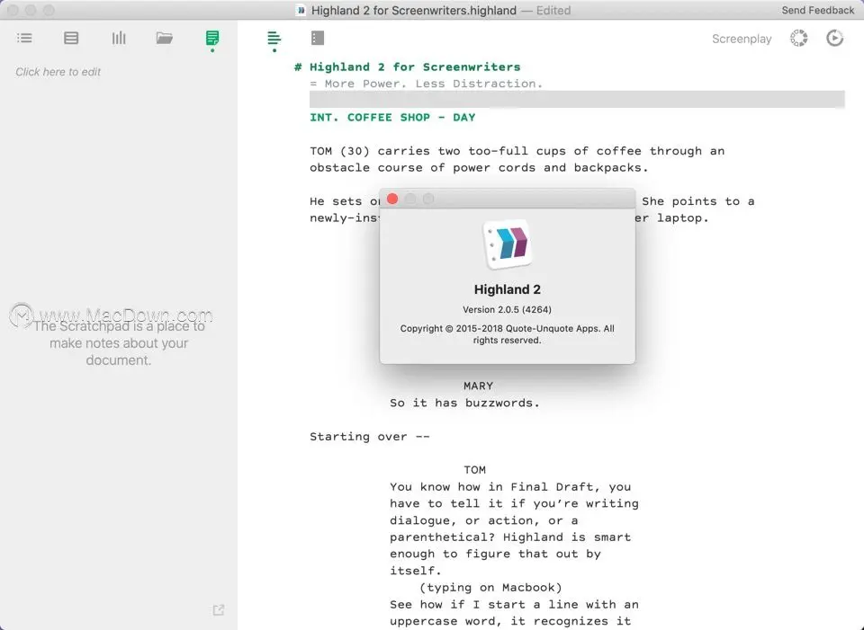 Highland Mac激活版是一款适用于Mac平台的写作软件,它可以帮助用户快速的编写剧本,软件自带快速写作功能,只需要一键即可让你在短时间之内记录自己想要写的东西,对于想要在最后时刻提交文稿剧本的写作人员来说可谓是神器了。更多Mac软件获取,来Mac软件下载平台Macdown探索一番吧!
