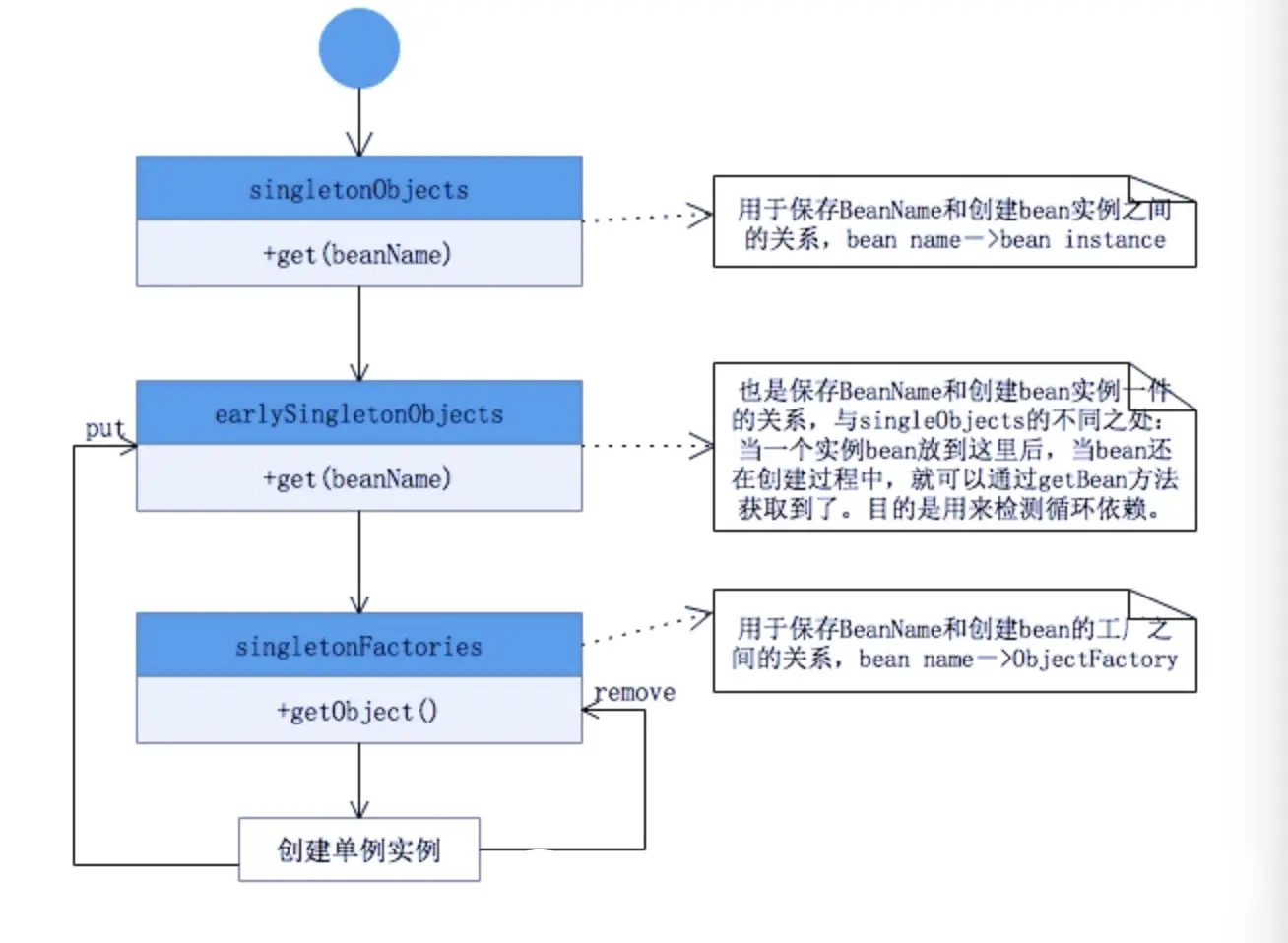 刚才说使用的时候就在容器里拿出来,这个时候怎么拿就成了一个问题,Spring的依赖注入使用的Bean实例默认是单例的,他是发生在AbstractBeanFactory的getBean里。getBean的doGetBean方法调用getSingleton进行bean的创建。下面是getSingleton()的过程图。