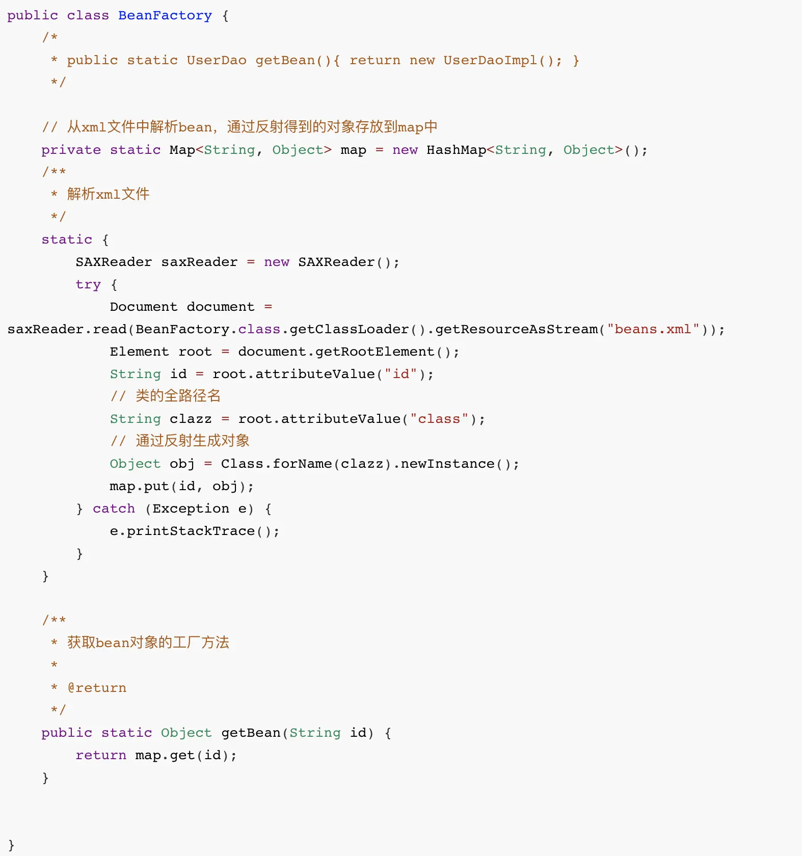 IOC他是一个容器➕控制反转,他把对象的创建权反转给Spring框架,使用的时候并从容器中取出。接下来我们模拟IOC的设计,第一步创建一个工厂,里面写入获取bean对象的工厂方法,从xml文件中解析bean,通过反射得到的对象存放到map中并解析xml;举个实例图。