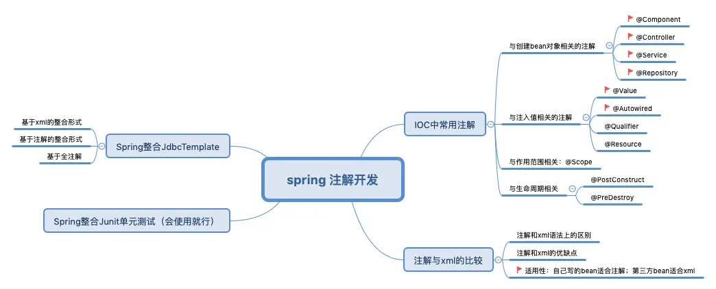 因为注解的配置简单,维护方便,所以我们接下来引入注解对Spring项目进行开发,首先说一下Spring对jdbc的整合,导入jdbc的依赖之后,我们只需要在配置文件中把jdbc当成一个bean注入到需要使用的层,然后使用Spring的模版控制器Template,JdbcTemplate就可以使用了!到了后面使用Spring boot的时候开箱即用,直接导入依赖,加上注解就可以使用了。然后说一下IOC涉及到注解,第一个关于Bean对象的注解,@Component @Controller @Service @Repository,配置创建到销毁;第二个用于注入值的注解,@Value @Autowired @Qualifier @Resource;第三个与生命周期相关的注解,@PostConstruct @PreDestroy;第四个与作用范围相关的注解,@Scope;第五个与全注解相关的注解,@Configuration、@ComponentScan、@Bean、@Import、@PropertySource。最后就是Spring整合了junit的注解,首先引入依赖,然后在单元测试类上加@RunWith、@ContextConfuguration注解,最后在单元测试类中声明测试目标,加上@Autowired即可。下面是关于注解开发这个学习的示意图。