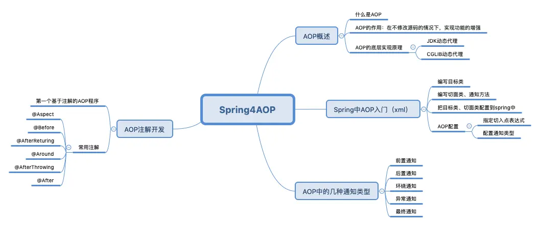 AOP是一个切面编程,横向抽取的机制对在不修改原对象代码的情况下,通过通过代理对象,调用增强功能的代码,从而对原有业务方法进行增强!他有两种实现方式,一个是JDK动态代理,对目标类进行代理,另一个是Cglib动态代理,是对目标类的子类进行代理。AOP使用中会有以下这些构成:第一个连接点,指那些被拦截的点;第二个是切入点,是指我们要对哪些连接点进行拦截;第三个是通知,指拦截到连接点之后要做的事情,分为前置通知、后置通知、异常通知、最终通知和环绕通知;第四个就是引介,在一种特殊的通知在不修改代码的前提下,对运行期动态添加一些方法;第五个是目标对象,也就是代理的对象;第六个是织入,是指把增强应用到目标对象来创建新的代理对象的过程;第七个是代理,一个被AOP织入增强后产生的结果代理类;第八个切面,切入点和通知的结合。最后就可以用一些注解,写一个切面了!下面是AOP总结的图。