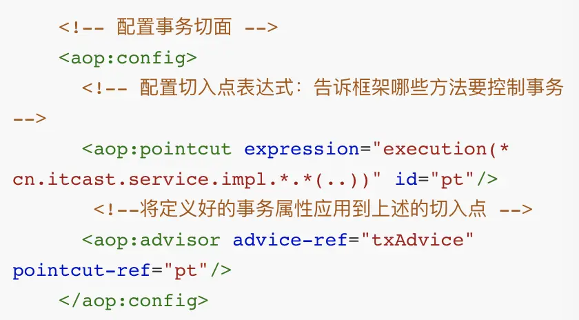 我们首先配置xml形式的事务,可以看到具体的操作。 第一步我们要配置事务管理器,在配置文件中加上DataSourceTransactionManager;如图。