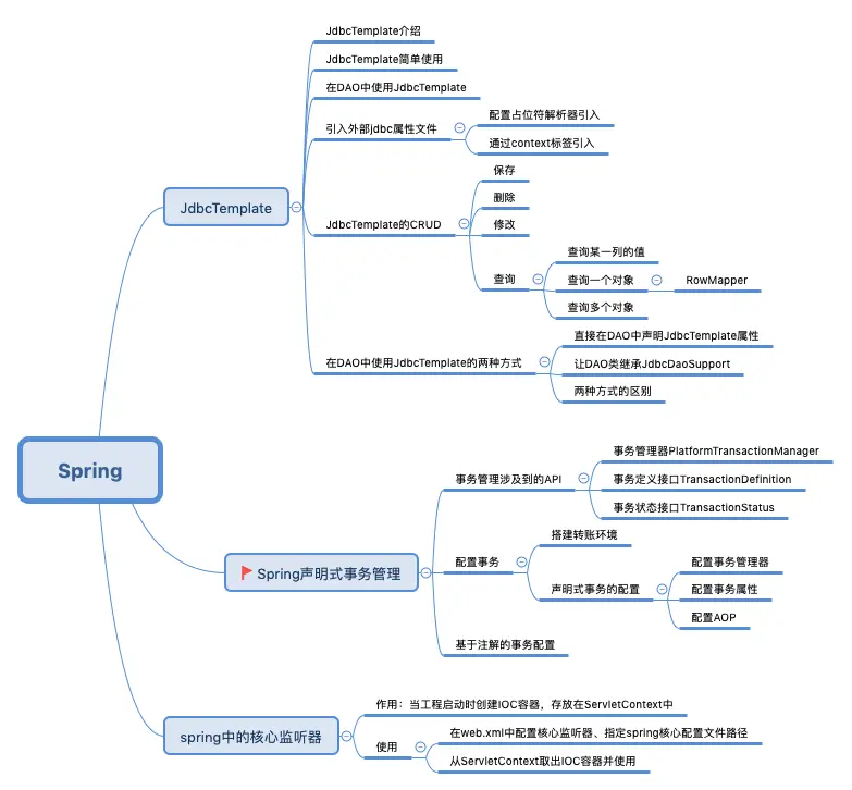 ContextLoaderListener是Spring中的核心监听器,当web工程启动时,该监听器负责创建Spring的IOC容器,存放在ServletContext中;当需要用IOC容器时,就从ServletContext中获取。最后给大家JDBC、声明事务控制和核心监听器的总结图。