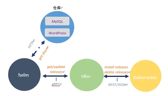 - tiller:服务端,负责接受helm请求,在K8s中管理实例中定义的资源。