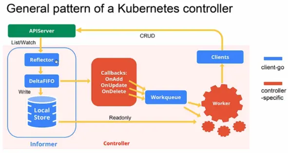 controller本身的实现比较复杂,可以简单理解为,controller会直接和apiserver进行交互,监听资源变化产生的事件,将事件入本地队列后controller中用户定义的处理逻辑从本地队列中取事件进行处理。事实上,不仅仅是CRD资源会使用controller,原生资源的事件处理也依赖于controller,两者在工作机制上是完全一致的。
