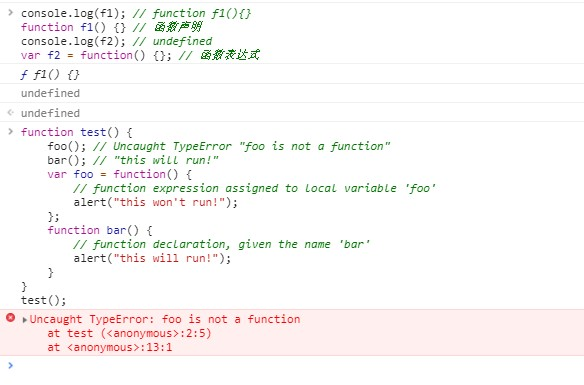 前面说变量名和函数都会上升,而遇到函数表达式var foo = function(){}时,首先会将var foo上升到函数体顶部,而此时的foo的值为undefined,所以执行foo()报错。