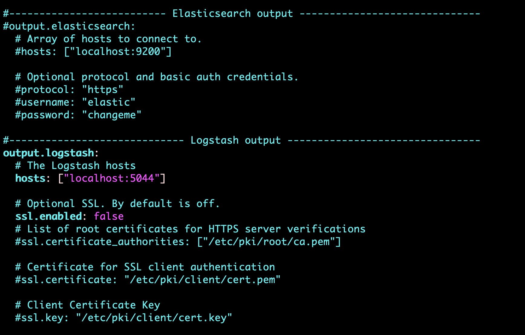 因为logstash我还想用,所以output是到logstash上的,需要把上面输出到elasticsearch的配置注释掉,并且将下方关于logstash的注释打开。