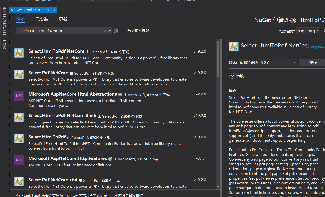 首先安装Select.HtmlToPdf.NetCore NuGet包