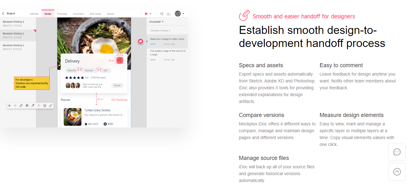摹客是面向设计人员和开发人员的在线协作工具。除了为交互式原型提供丰富的动画效果之外,设计人员还可以从PS,Adobe XD和Sketch中上传原型和视觉设计,通过对应的工具插件自动生成标注、切图信息,方便交付。