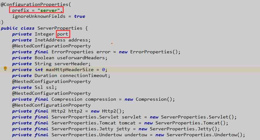 在ServletWebServerFactoryAutoConfiguration类上,有一个@EnableConfigurationProperties注解:开启配置属性,而它后面的参数是一个ServerProperties类真正加载配置的就是这个类。