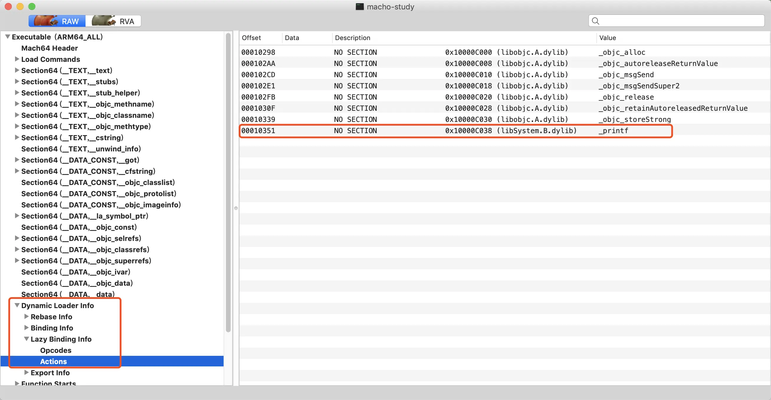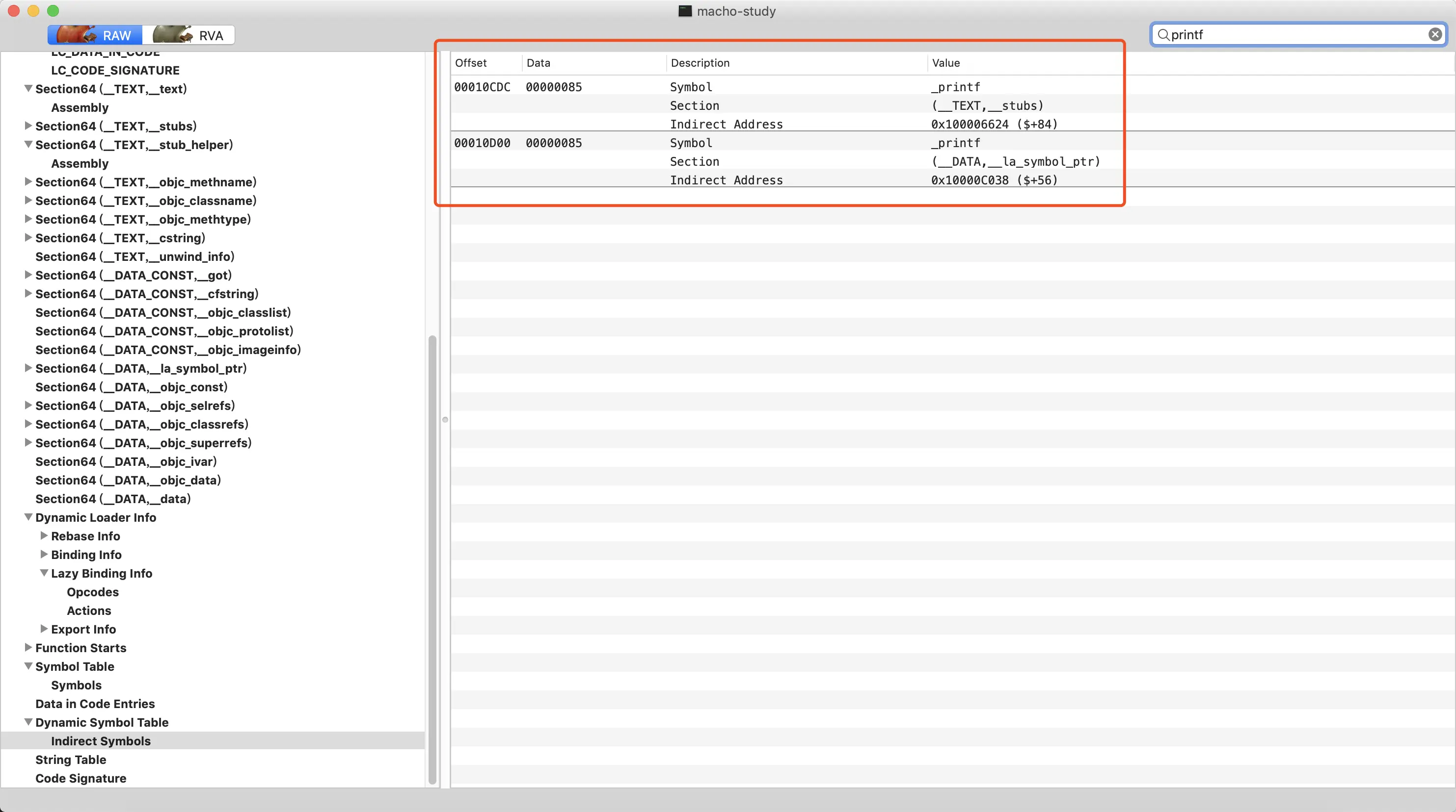 猜想:通过二进制的中的Dynamic Symbol Table可以获取到printf这个符号对应的信息,其中就包括其调用地址在la_symbol_ptr段的位置,这样就能够进行数据的回写。如下图: