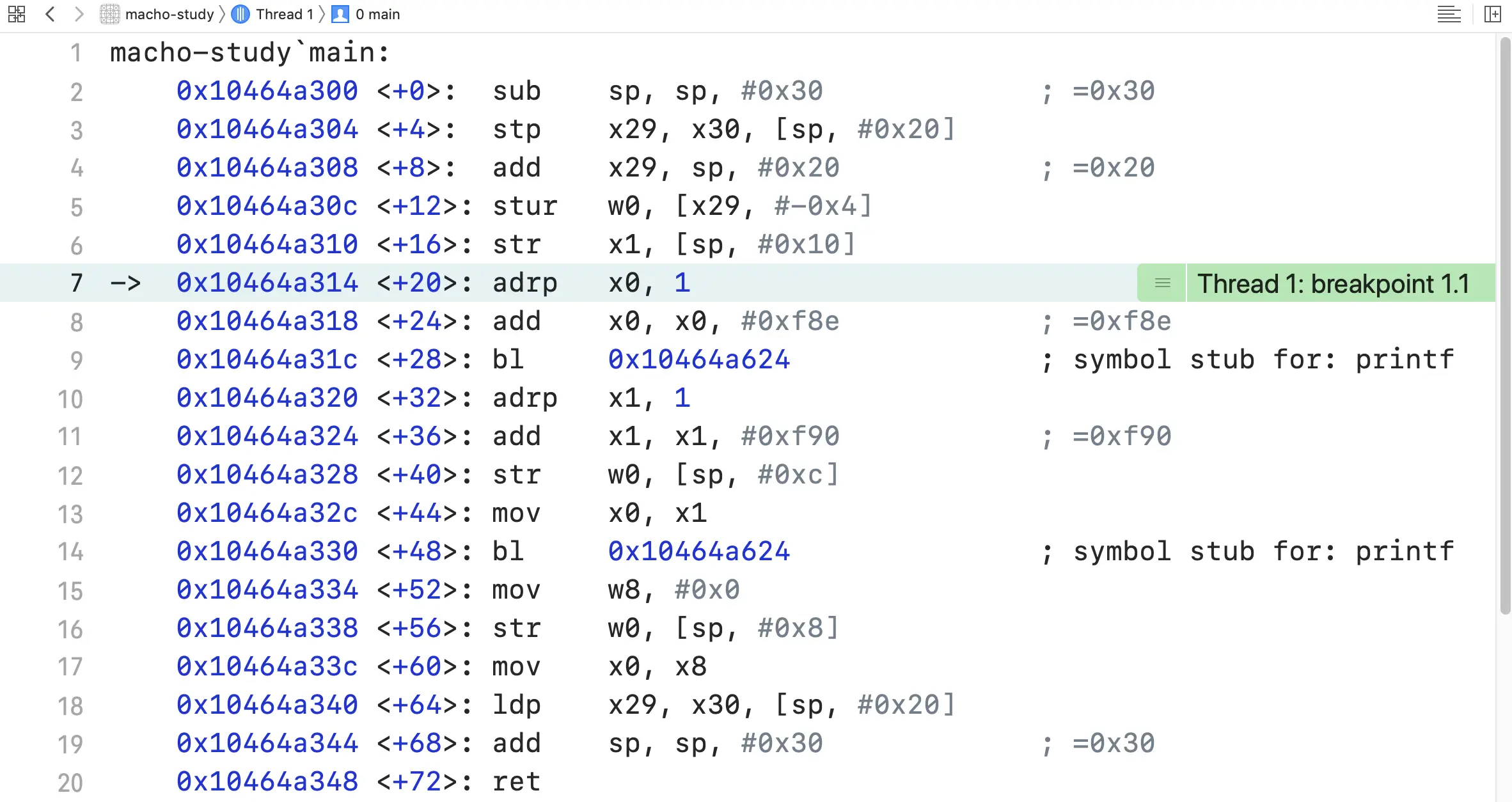 图2展示了main方法的汇编代码,可以看到printf在main中被调用了两次,两次均是通过bl 0x10464a624来尽心跳转调用的,这里系统已经帮我们查询到了0x10464a624对应的符号,就是symbol stub for: printf,这也就是printf的桩函数。