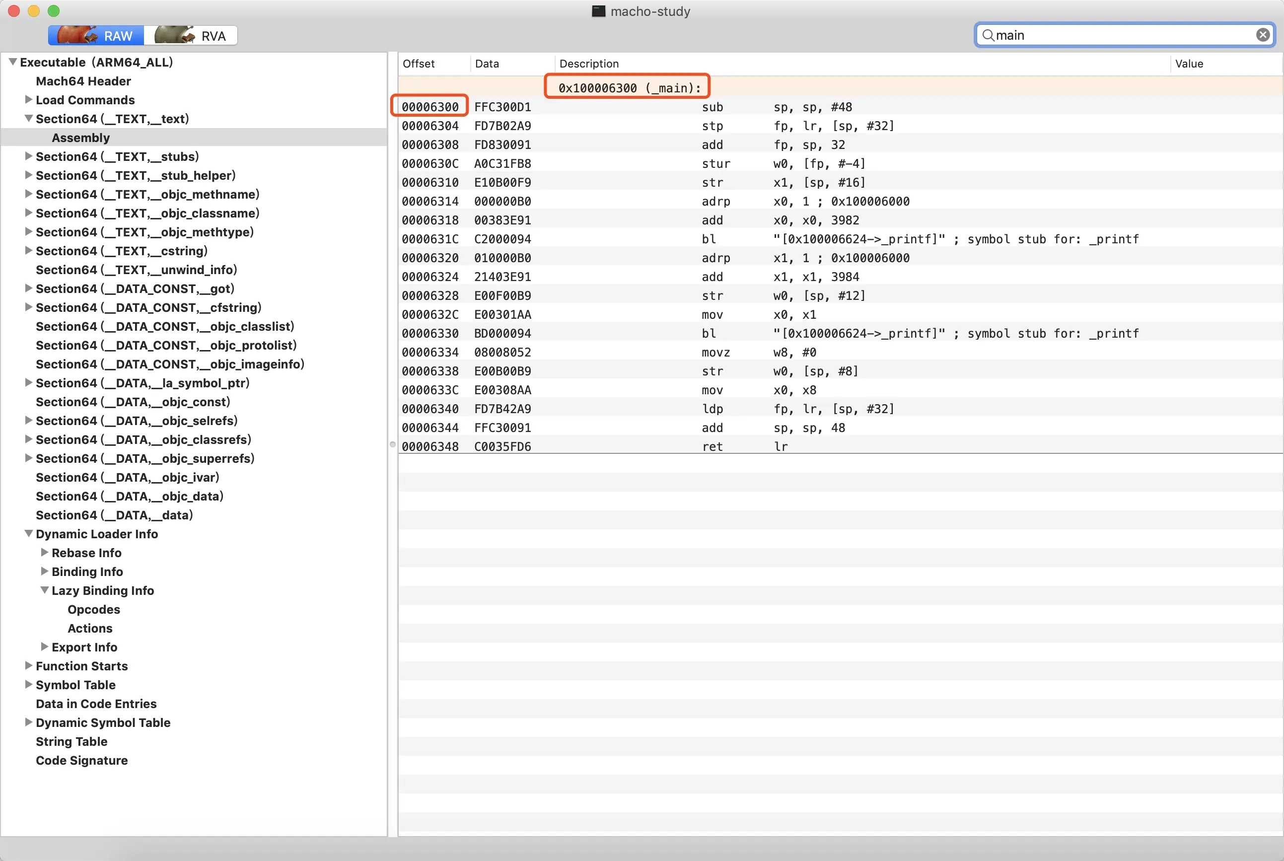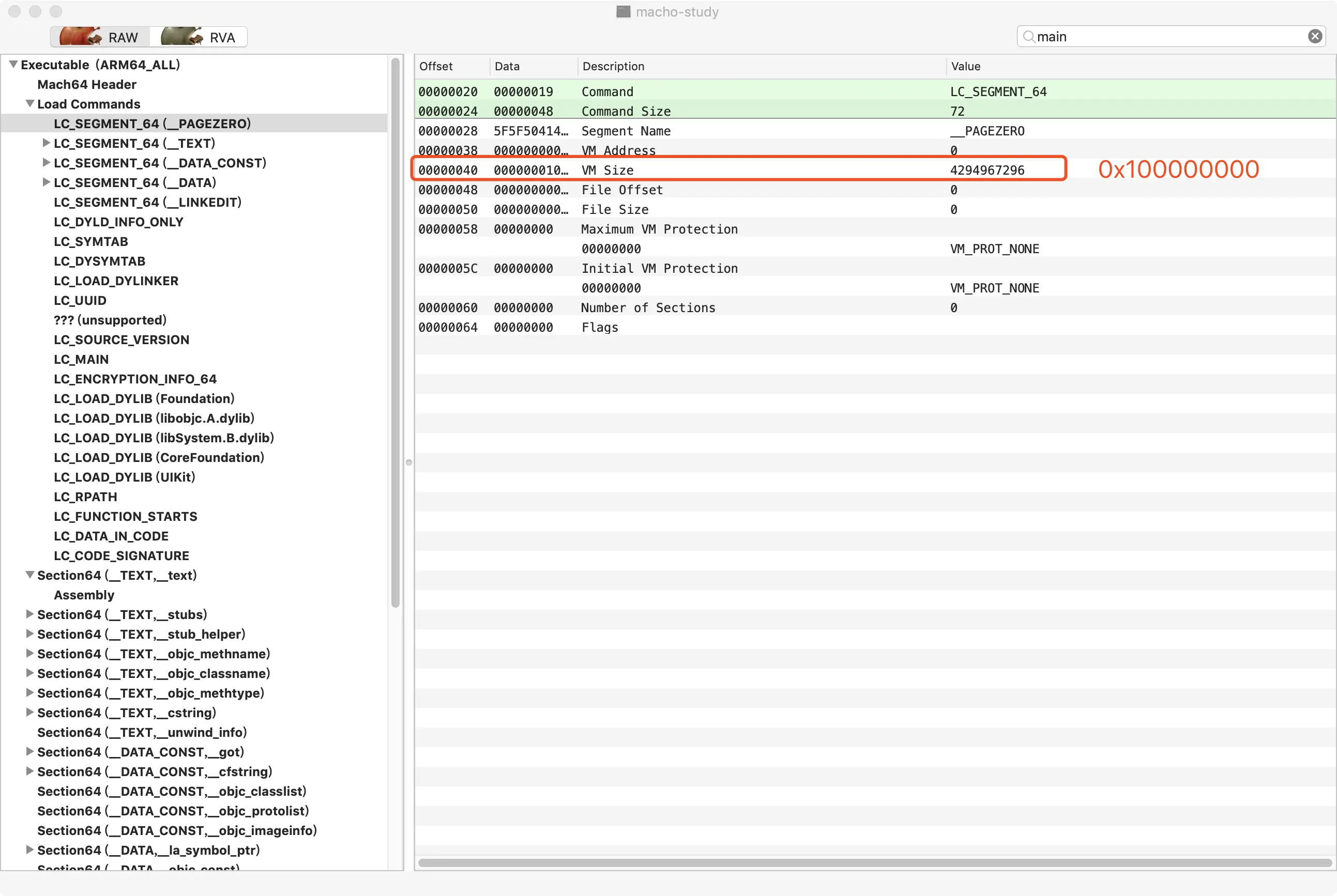 先不着急看桩函数的实现,我们先来看一下这里的调用地址。由于ASLR(Address Space Layout Randomization,地址空间布局随机化)的存在,每次我们的App启动时,二进制加载的首地址都是被随机分配的,这是iOS防范黑客的一种手段。在我们的示例中,可以看到main函数的入口是地址是0x10464a300。在MachOView中我们可以在__TEXT,__text段中搜索main方法,如图3所示。在图中可以看到,main函数的首地址是0x100006300,它是由_main方法在二进制文件中的偏移0x00006300,加上__PAGEZERO段的虚拟内存0x100000000(图4)计算得到的。也就是说,如果没有ASLR,那么main函数的地址就应该是0x100006300。我们通过diff就可以知道,当前我们的程序运行时的ASLR偏移是0x10464a300 - 0x100006300 = 0x4644000。记住这个偏移量,我们后续会用到。当你重新启动或者Debug的时候,这个偏移量每次都会变化。