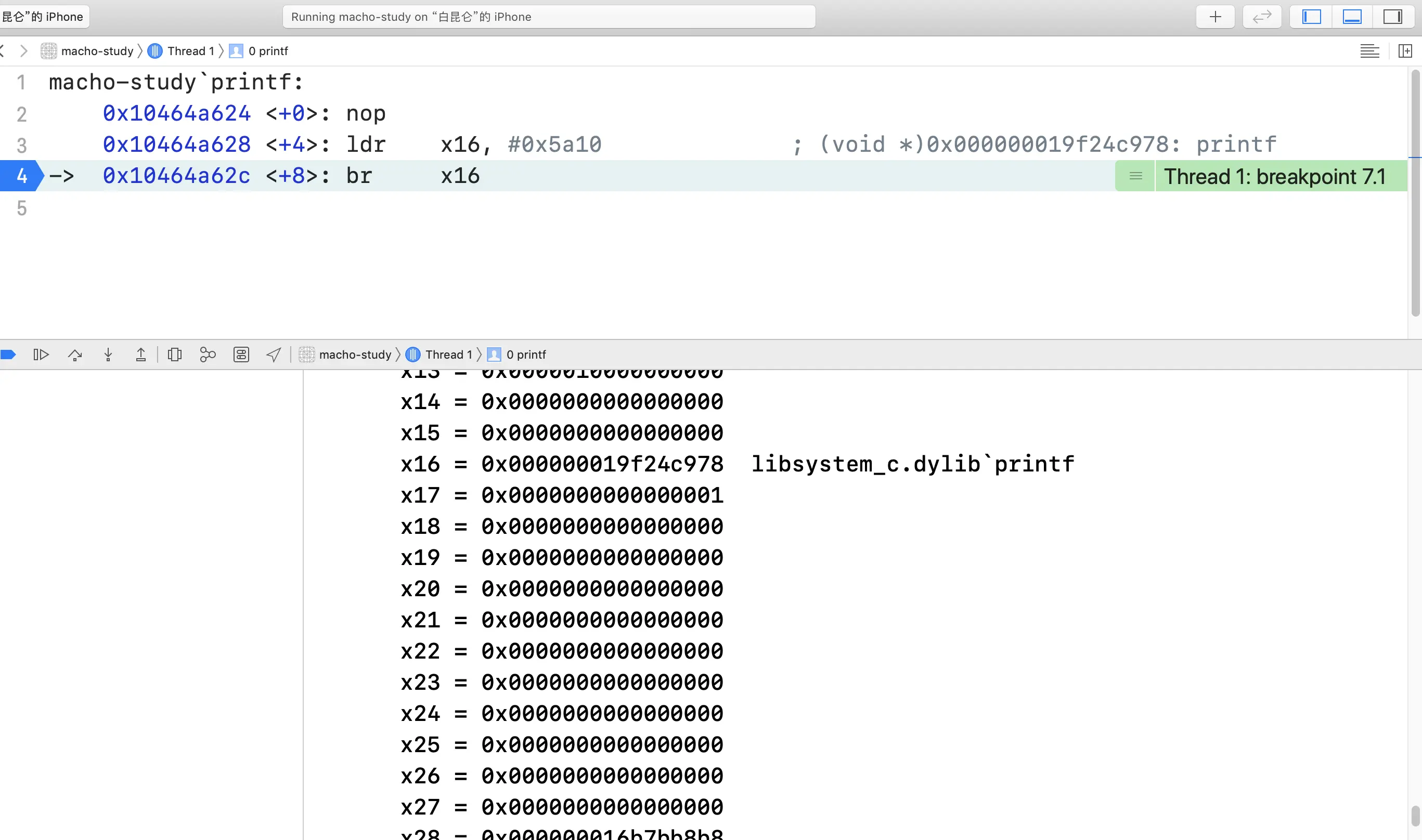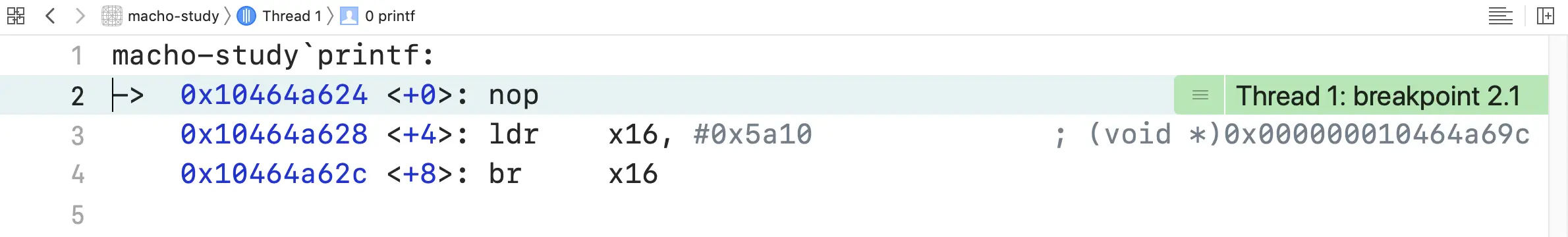 我们要追踪的就是printf这个函数是如何调用的。在我的arm64真机设备上进行调试。首先在printf("1")处打一个断点,通过Debug->Debug Workflow->Always Show Disassembly将代码切换至汇编,方便我们观察调用地址。如图2所示。