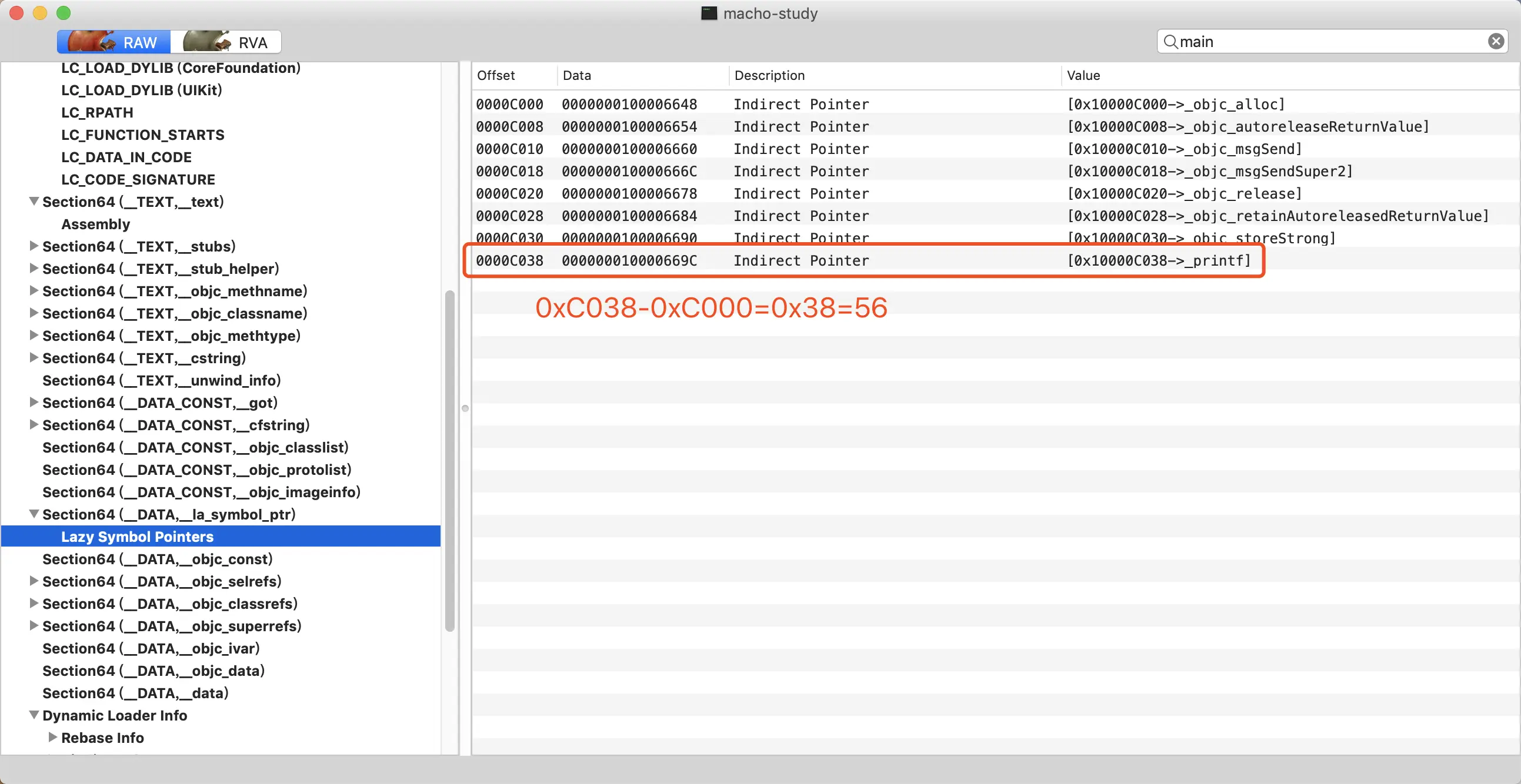 可以看到,0x104650038这个地址存储的数据是0x10464a69c,这与图5中Xcode给我们解析出来的调用地址是相吻合的。而0x104650038这个地址存在于二进制中的__DATA.__la_symbol_ptr段的第56偏移行。我们通过MachOView去定位,发现这正好存储的就是_printf符号的懒加载指针数据,如图7所示。同时我们也可以通过偏移地址来进行验证,0x104650038 - 0x4644000 = 0x10000C038,也正好匹配MachOView中显示的地址。