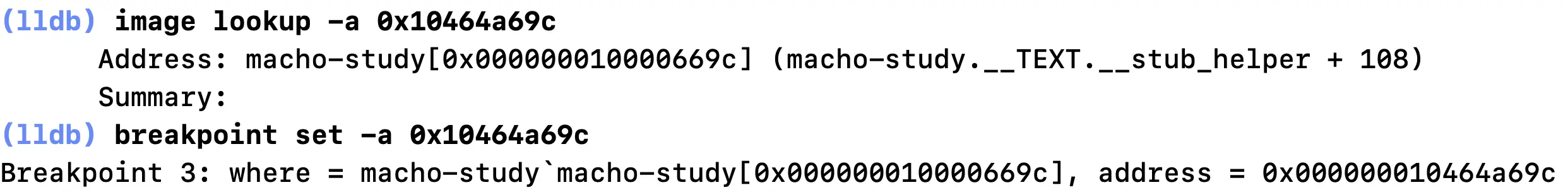 那么桩函数的作用很清楚了,就是读取lazy_symbol_ptr中对应符号的地址,然后跳转。但是此时我们读取到的跳转地址0x10464a69c并不是printf真正的调用地址。我们继续追踪一下这个地址。可以看到,这个地址位于当前二进制的__TEXT.__stub_helper段的108偏移行。我们在这个地址打一个断点,继续让程序运行。