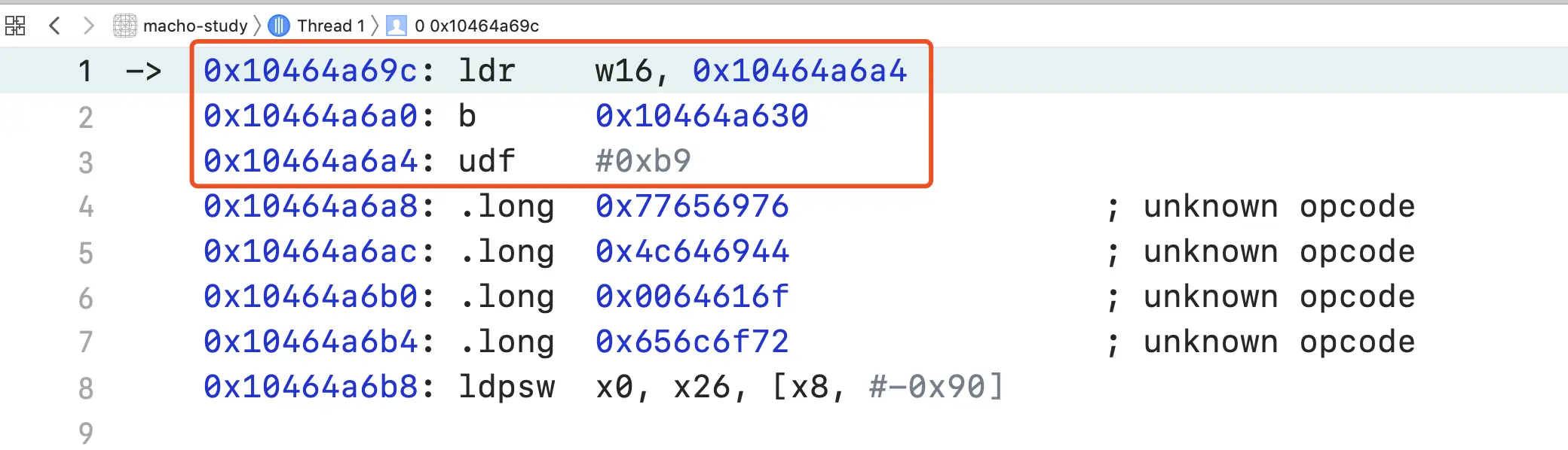 0x10464a628 <+4>: ldr x16, #0x5a10 // x16 = *(pc + 0x5a10) = *(0x10464a628 + 0x5a10) = *(0x104650038)
