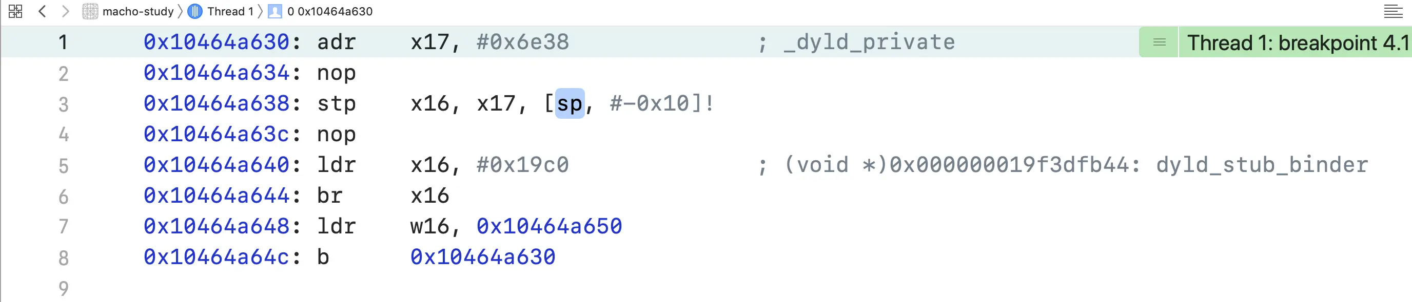 0x10464a638: stp x16, x17, [sp, #-0x10]! // 移动SP栈指针,将存储在x16和x17中数据入栈