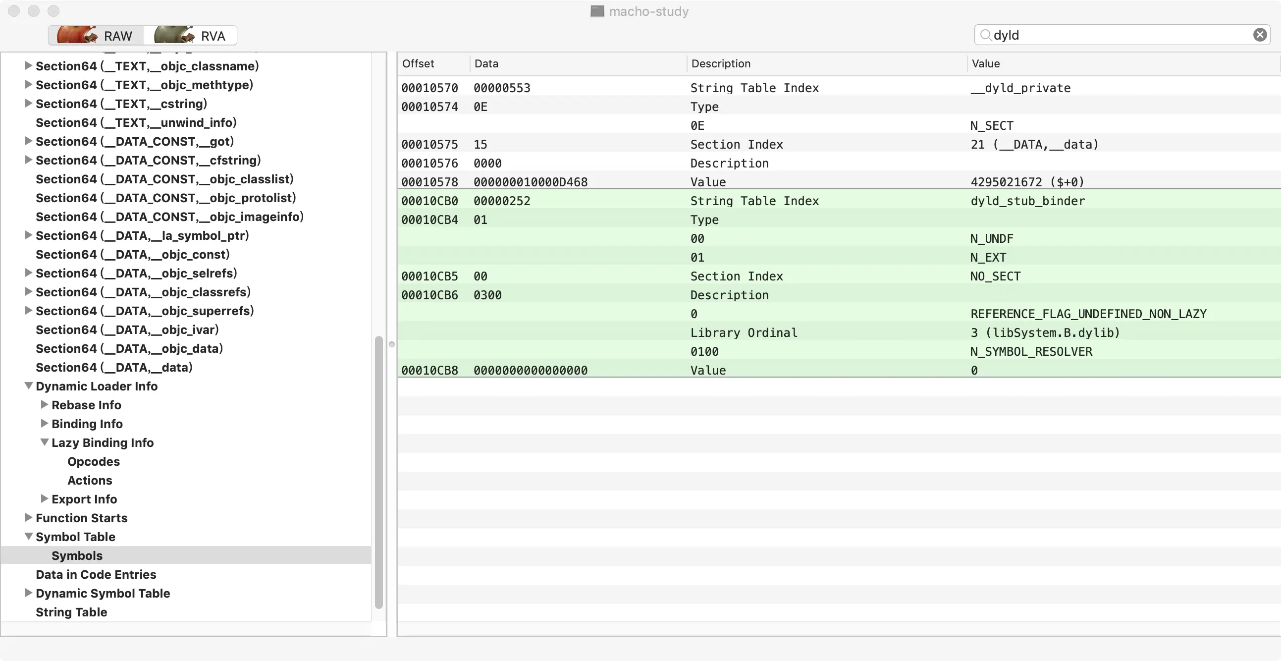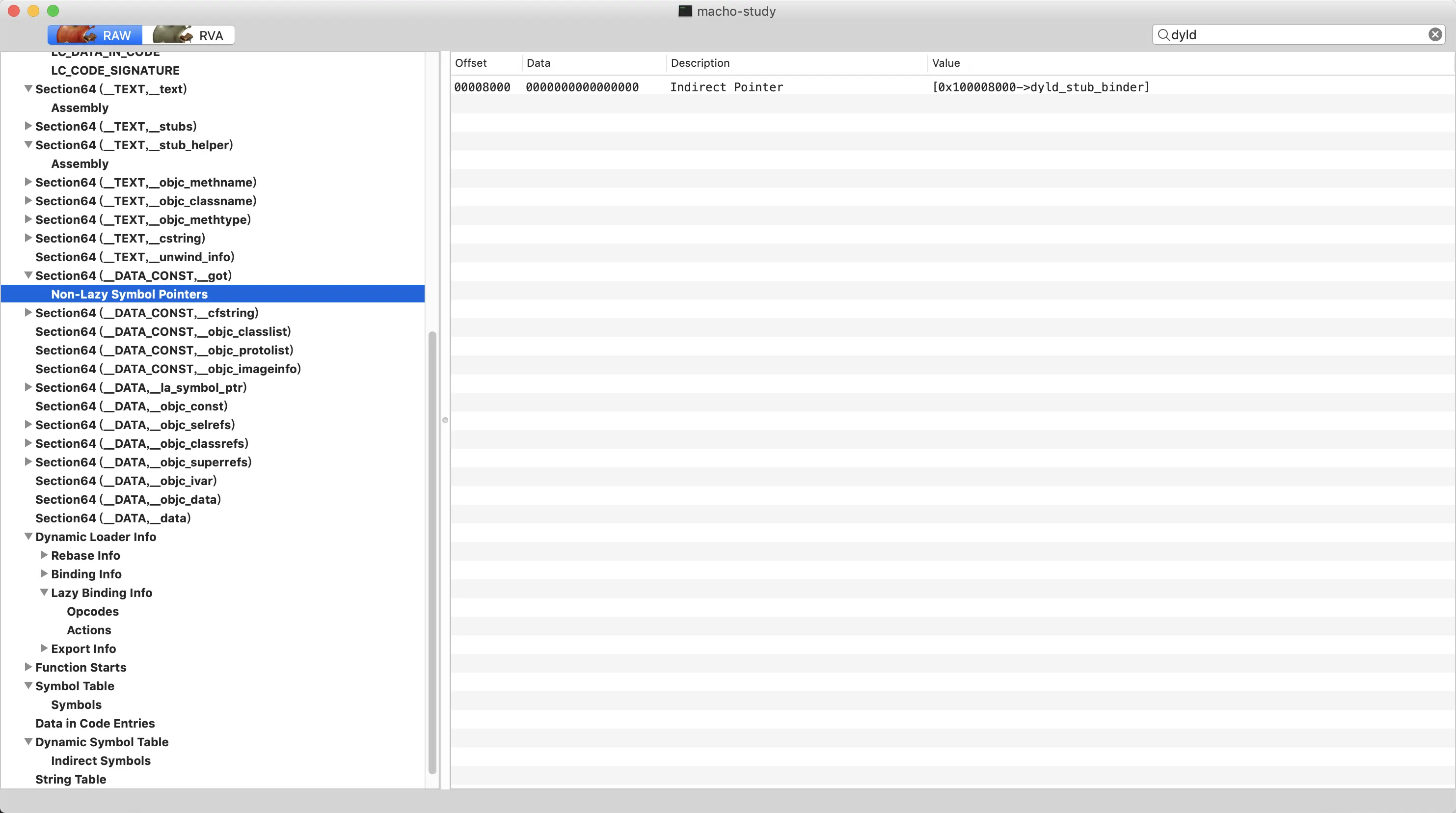 猜想:在lazy_bind_info中并没有找到dyld_stub_binder这个符号的信息,也就是说,它并不是通过延迟绑定机制确定的地址。在Dynamic Symbol Table中看到,与printf不同,其关联地址是在__DATA_CONST,__got这个数据段,而这个数据段如图16所示,是一个Non-Lazy Symbol Pointers。所以dyld_stub_binder这个符号的地址一定是在二进制加载的时候就已经确定了,而不是通过后期的延迟绑定