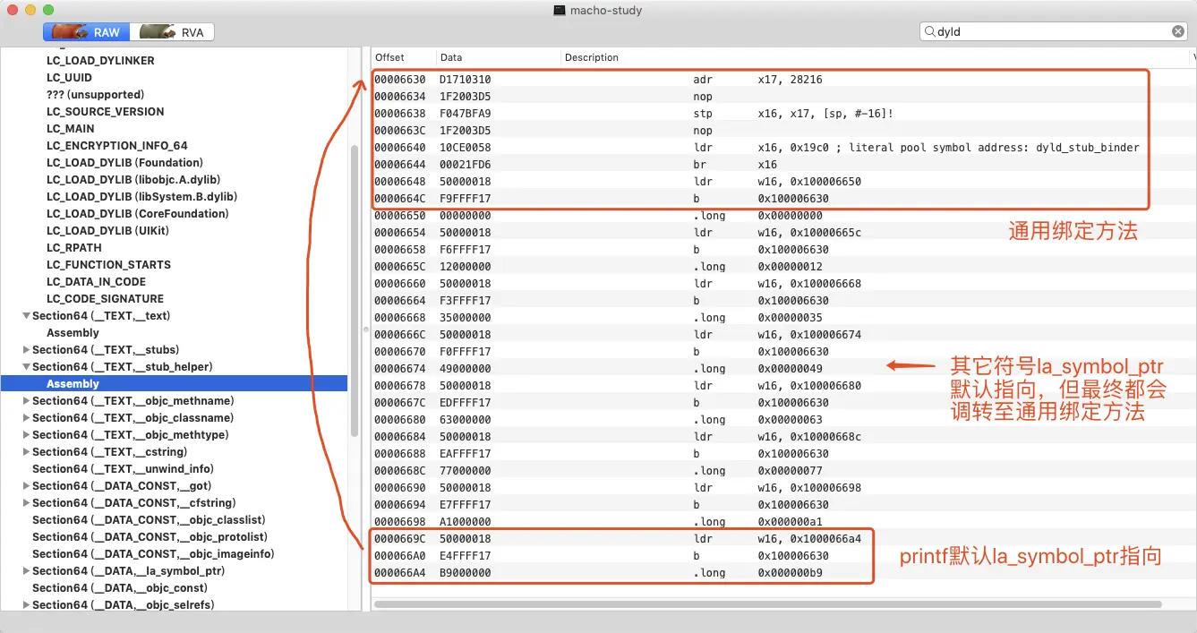 之前看了很多的关于延迟绑定的文章,对stub、stub_helper、la_symbol_ptr这些概念有了一定的认识,知道对于外部定义的函数调用,首次调用需要在运行时期间借助stub_helper来动态寻找到函数调用的地址,然后存储到la_symbol_ptr段的数据段中。第二次访问的时候,就直接调到该函数调用的地址就可以了。但是要是问到具体的细节还是一知半解,今天就准备自己动手把它弄懂弄透。