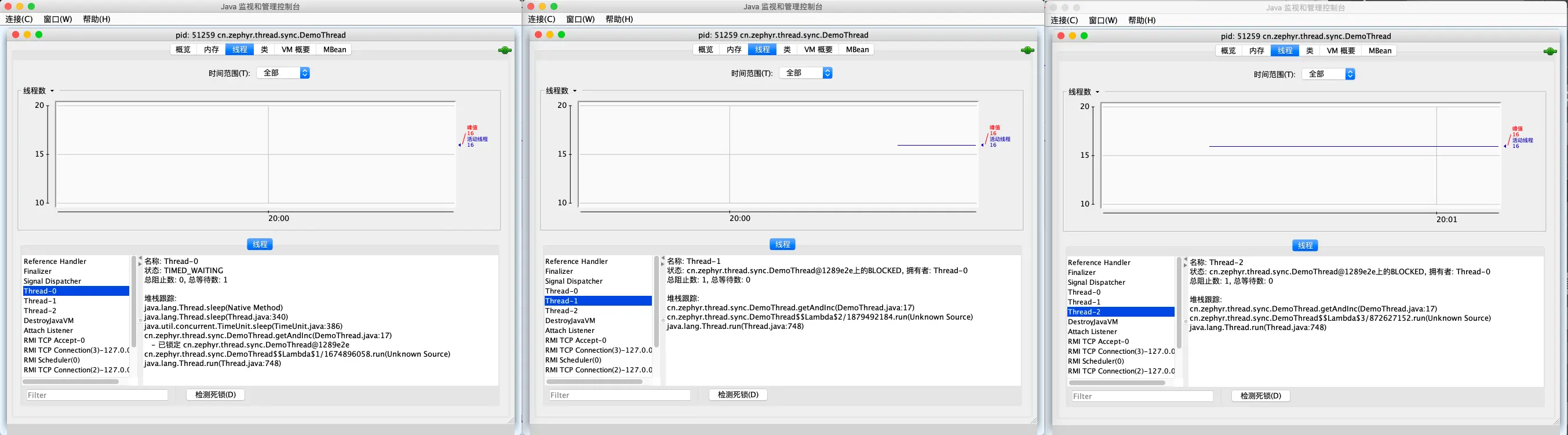 可以看到Thread-0处于休眠状态,Thread-1、Thread-2处于阻塞状态