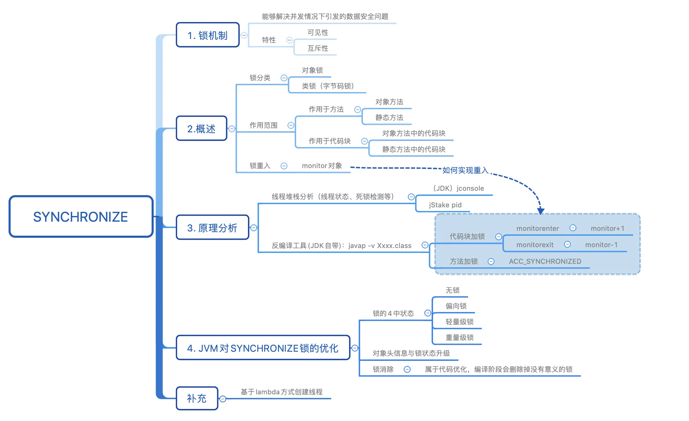 flags: ACC_SYNCHRONIZED标记实现的,对应到对象的monitor对象(属性)上,则 进入带有时ACC_SYNCHRONIZED标记的方法时monitor+1,退出方法时monitor-1,直到monitor=0; - 锁重入时,如果是同一线程时(根据线程唯一id判断),则累计+1或-1,不用再重复获取锁对象