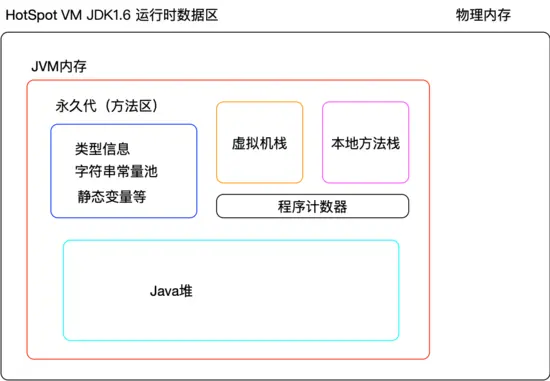 HotSpot VM JDK 1.6 的运行时数据区示意图如下: