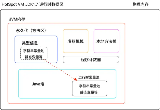 "永久代(Permanent Generation)",可以理解为 JDK 1.8 之前 HotSpot 虚拟机对《Java 虚拟机规范》中"方法区"的实现。从 JDK 1.6、1.7 到 1.8+,HotSpot 虚拟机的运行时数据区变迁示意图如下: