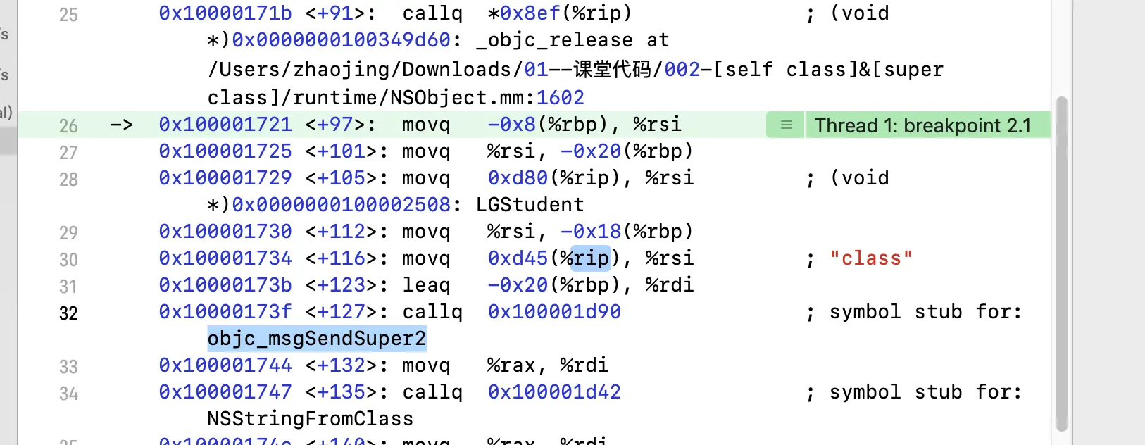 我们知道receiver是self,cls是self的父类,_objc_msgSendSuper2其实就从self的父类开始查找方法,但是消息接受者还是self本身,也就类似是让self去调父类的class方法,所以返回的都是LGStudent