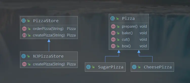 抽象类PizzaStore(披萨店)定义了 createPizza()方法,子类NJPizzaStore(南京披萨店)实现创建Pizza的方法,在准备过程中prepare(),从指定的原料工厂NJPizzaIngredientFactory 获取原料。