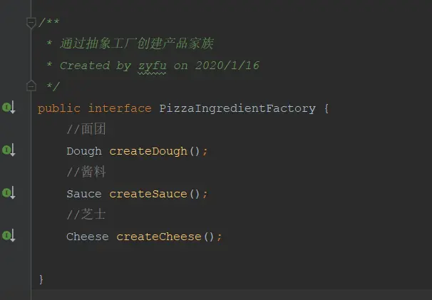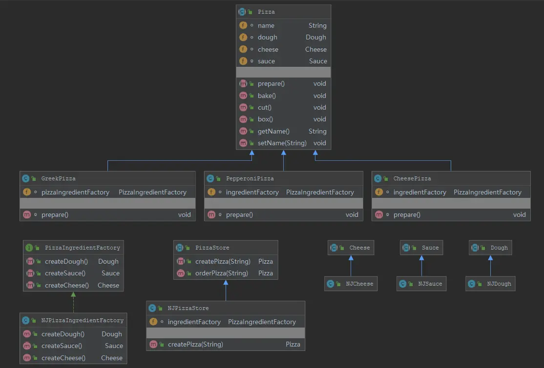 PizzaIngredientFactory 为原料工厂接口, NJPizzaIngredientFactory为一个具体的原料工厂,它生产特定的Dough、Souce、Cheese