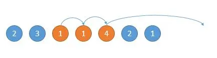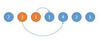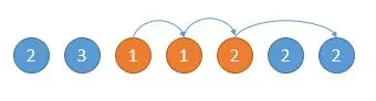 如下图,开始的位置是 2,可跳的范围是橙色的。然后因为 3 可以跳的更远,所以跳到 3 的位置。