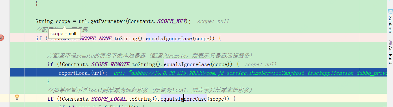 - 本地暴露源码判断:当scope未设置属性时候,默认会先将服务暴露到本地,默认在引用服务的时候,优先从本地引用,假如明确知道服务是远程应用,那么可以强制指定scope=“remote”