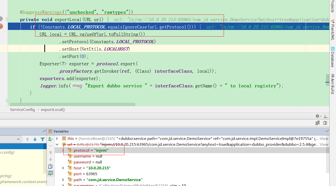 图片3,图片4是设置了protocol为injvm但是其实并不会暴露到本地,可以看见在执行exportLocal方法时候要是injvm开头的不会执行