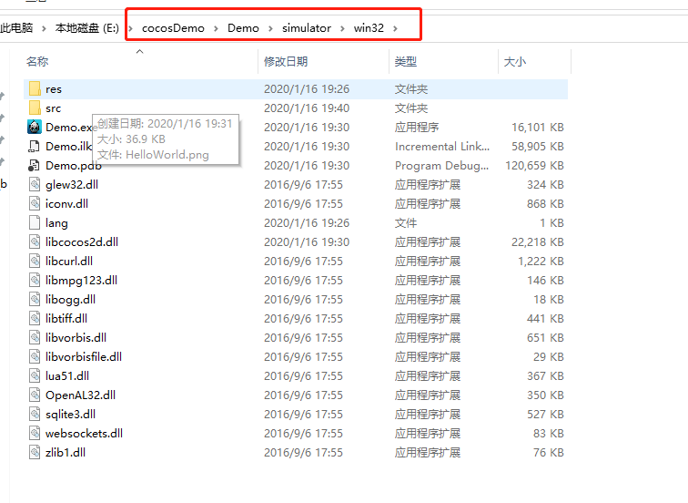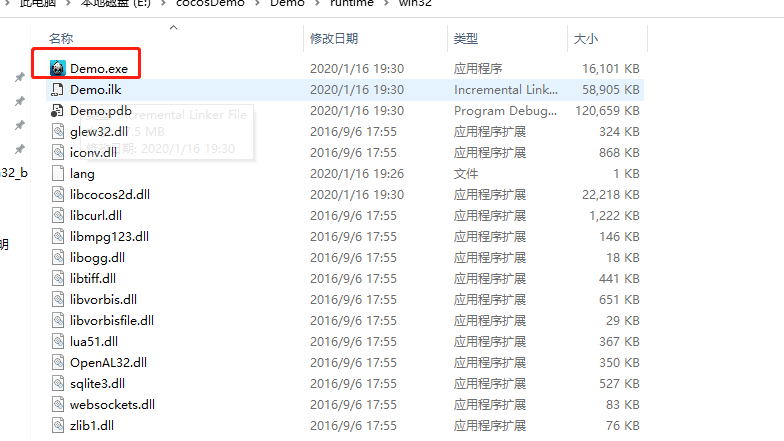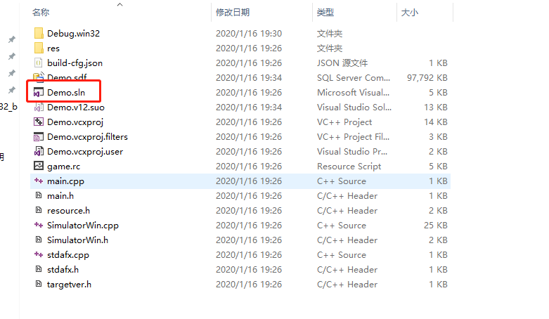 5、执行完毕后,找到你刚才在相应盘符下新建的project, 我的是在e盘下,文件夹名字-- cocosDemo,我的project 名称是Demo 找见项目中 frameworks\runtime-src\proj.win32 目录下,找到一个后缀名是sln的文件,用VsStudio打开,然后点击本地调试。 等待一段时间,让VsStudio 飞一会儿