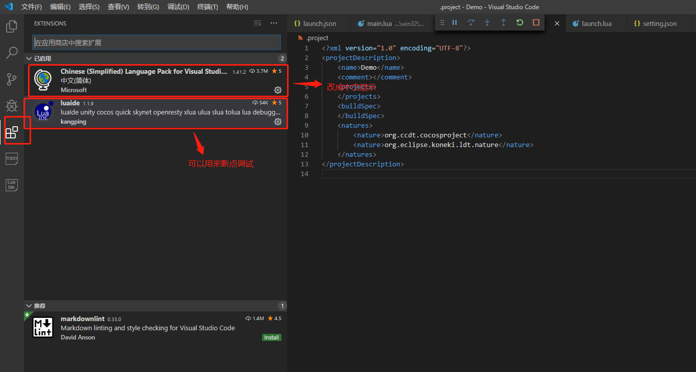 1、打开VsCode,将你刚才的工程导入。具体步骤,点击“文件” -> “打开文件夹”,将目标文件夹打开(即前面的'项目名称') 下图这个两个插件,建议装一下。 第一个是修改成中文,第二个是一个lua开源调试的插件(7天免费试用,100元终身)。