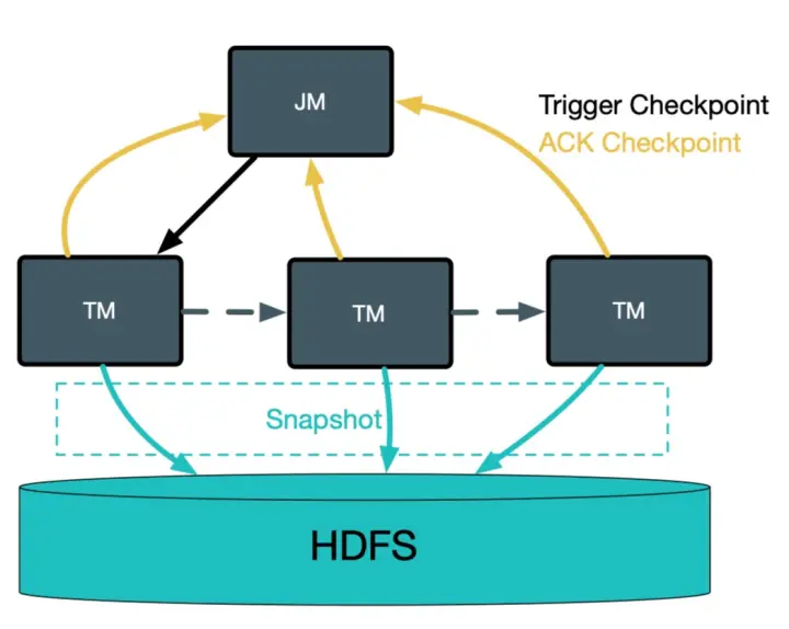 不管使用 FsStateBackend、RocksDBStateBackend 还是 NiagaraStateBackend,Flink 在进行 checkpoint 的时候,TM 会将状态快照写到分布式文件系统中,然后将文件句柄发给 JM,JM 完成全局 checkpoint 快照的存储,如下图所示。