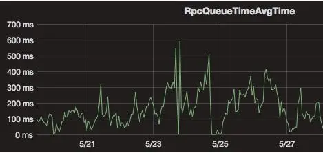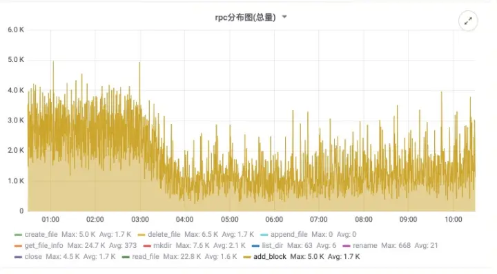 对于全量 checkpoint 来说,TM 将每个 checkpoint 内部的数据都写到同一个文件,而对于 RocksDBStateBackend/NiagaraStateBackend 的增量 checkpoint [2]来说,则会将每个 sst 文件写到一个分布式系统的文件内。当作业量很大,且作业的并发很大时,则会对底层 HDFS 形成非常大的压力:1)大量的 RPC 请求会影响 RPC 的响应时间(如下图所示);2)大量文件对 NameNode 内存造成很大压力。