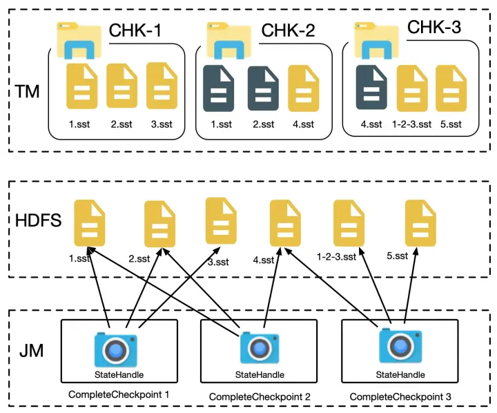 - checkpoint X 完成后,我们增加 A‘ 的引用计数,减少 A 的引用计数,在引用计数降为 0 后将文件 A 删除(如果 JM 增加了 A’ 的引用,然后出现异常,则会从上次成功的 checkpoint 重新构建整个引用计数器)