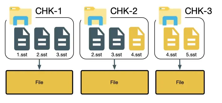 Flink 天生支持并发 checkpoint,因此小文件合并方案也需要能够支持并发 checkpoint,如果不同 checkpoint 的 sst 文件同时写往一个分布式文件,则会导致文件内容损坏,后续无法从该文件进行 restore。