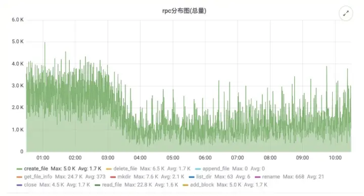 在该方案上线后,对 Namenode 的压力大幅降低,下面的截图来自线上生产集群,从数据来看,文件创建和关闭的 RPC 有明显下降,RPC 的响应时间也有大幅度降低,确保顺利度过双十一。