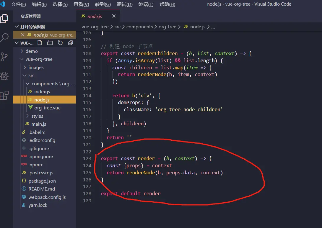 原来是个函数式组件,那么这个引入的一定是个函数了,编辑器全局搜render ,在src文件夹下有个node.js文件打开文件可以发现暴露了一个render函数