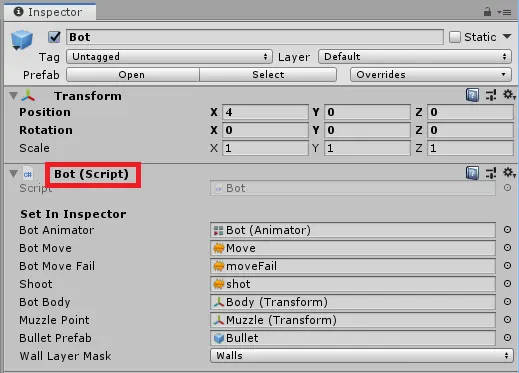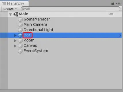 场景中最有趣的部分是Bot游戏对象,在层级窗口单击选中该对象。
